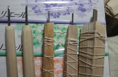 左から完成2本 右小刀・左小刀(五分) 未完成3本(平・丸・丸)。